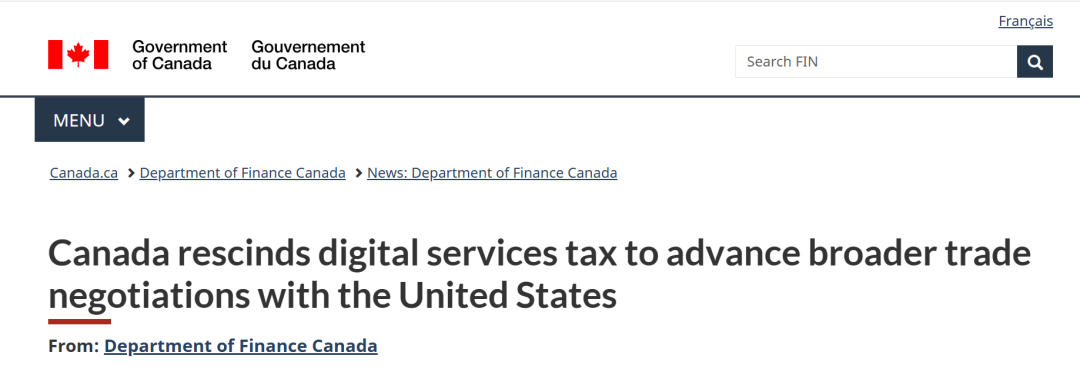 根据加拿大财政部发布的消息,由于加拿大政府正在就与美国政府建立新的经济和安全伙伴关系进行复杂的谈判,重点是为加拿大工人和企业争取到最好的交易。为表示对谈判进行支持,加拿大财政部部长商鹏飞(Fran ois-Philippe Champagne)宣布,将取消数字服务税(DST),以期与美国达成互惠互利的全面贸易安排。目前,加拿大总理卡尼(Mark Carney)和美国总统特朗普已同意各方将恢复谈判,以期在2025年7月21日之前达成协议。
